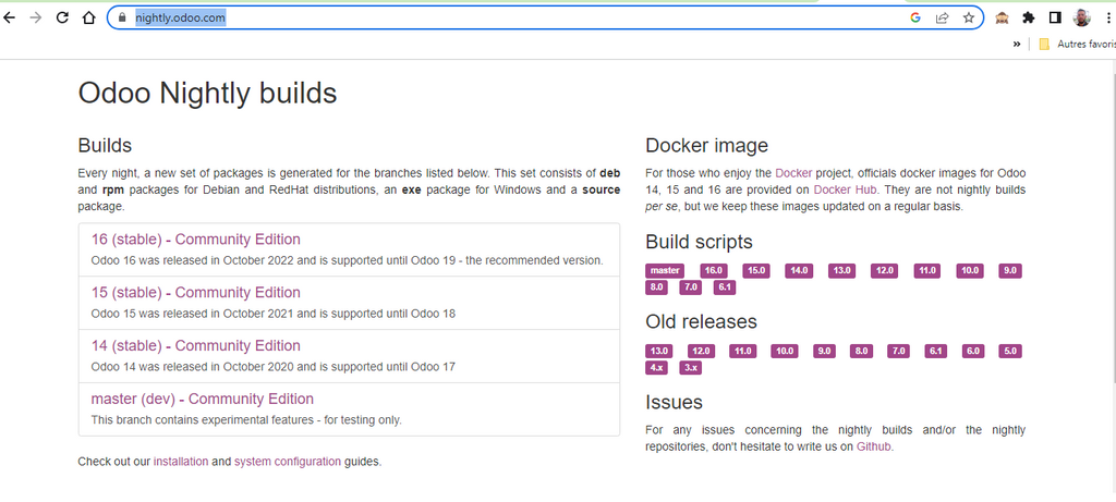 Afin de s’assurer que vous êtes entrain d’installer Odoo la dernière version, allez sur le lien officiel suivant: https://nightly.odoo.com/