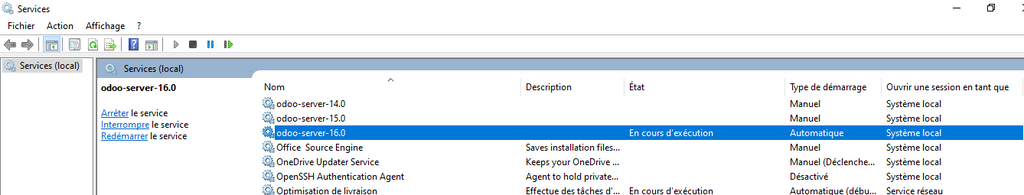 Vérifier que le service odoo-server-16 et le service est bien en marche (En cours d’exécution), sinon cliquez sur le bouton démarrer ou redémarrer le service.