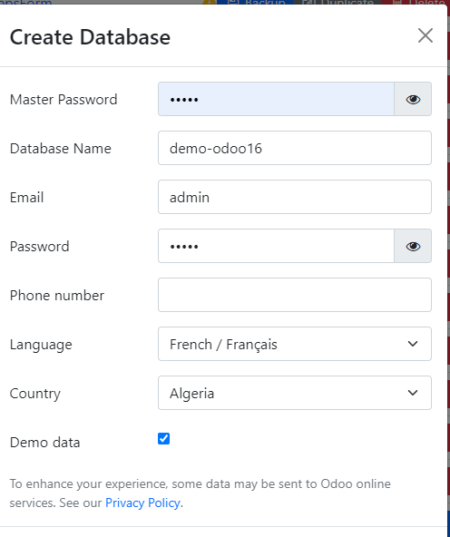 b.       Database name : Introduisez un nom à votre base de données (odoo-16-demo par exemple)