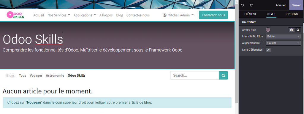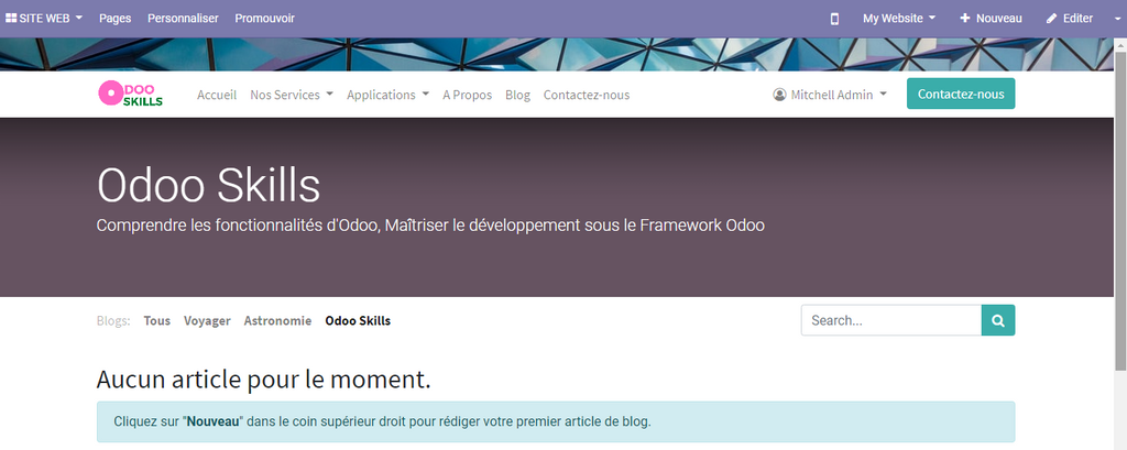 Si vous cliquez sur l'option Blog du menu principale , vous remarquez qu’Odoo ajoute automatiquement le titre de votre nouveau Blog , Odoo skills par exemple , qui ne contient aucun article.