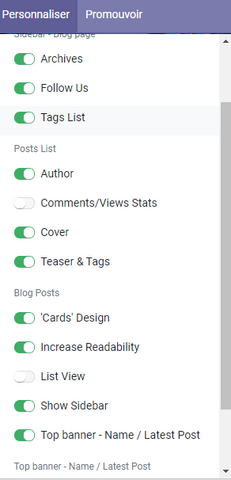 Pour personnaliser l’affichage de votre blog, sélectionnez la page des Blog dans le menu principal de votre site web, puis dans le menu du CMS Odoo à gauche, cliquez sur l’option personnaliser du menu principale, un sous menu sera affiché pour activer ou désactiver une option.