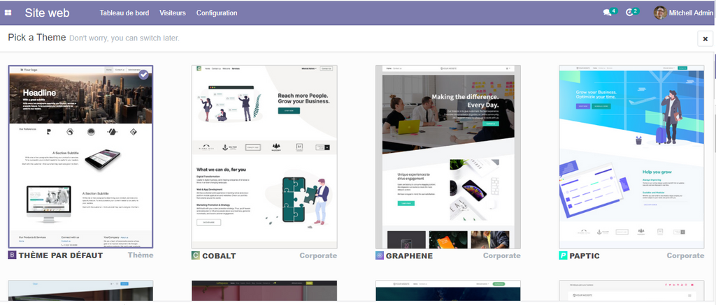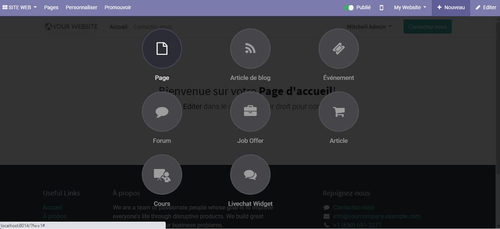 Avec le CMS (Content Management System) d’Odoo 14, vous pouvez en quelque clics seulement créer votre site prêt à l’emploi, sans avoir des connaissances de programmation web.