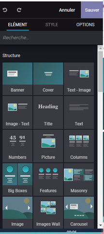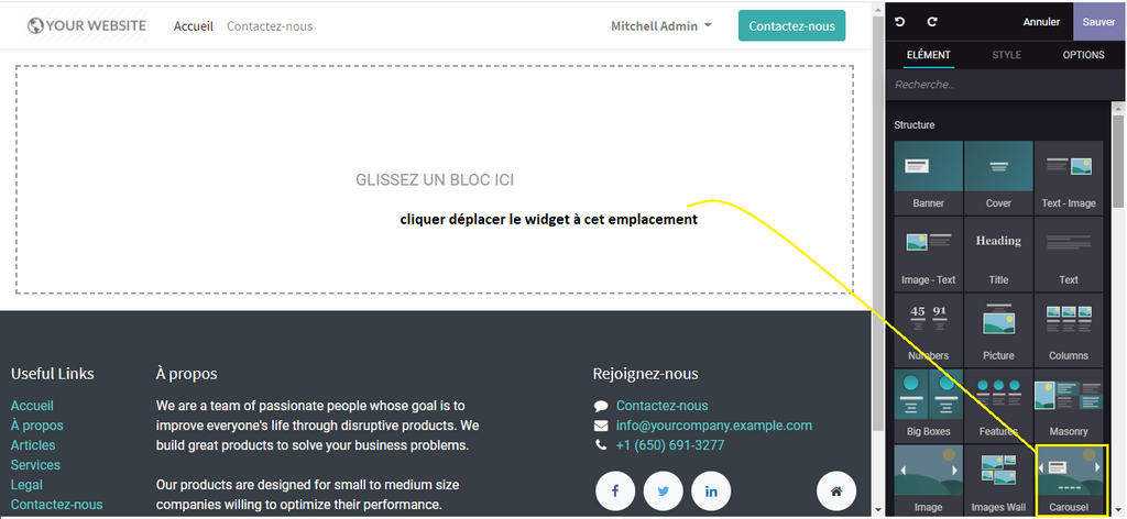 Avec la bibliothèque des composants du CMS Odoo , vous n’avez qu'à cliquer déposer l’élément souhaité, et votre site sera opérationnel instantanément, en cliquant sur l’option publier