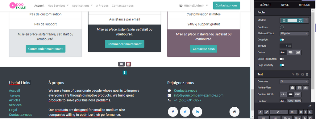Pour changer la mise en page du pied de notre site web, on clique sur Editer, puis on positionne notre souris sur le pied du site et on clique sur un élément (un lien par exemple) nous aurons à droite notre élément Footer. Vous pouvez modifier la disposition du pied de site en défilant le combo modèle, puis choisissez le modèle qui vous convient.