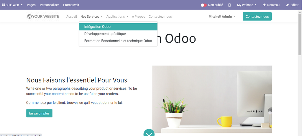 Une fois terminés, lorsqu’on clique sur la page Nos services, un sous menu s’affiche avec les options Intégration Odoo, Développement spécifique et formation, et en cliquant sur une option elle nous ramène vers la page de cette option.