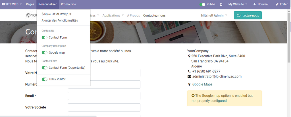 Par exemple, sur la page en sélectionnant la page contact, puis en cliquant sur l’option personnaliser , un sous menu se déroule pour nous permettre d’afficher ou pas le formulaire, d’introduire au pas le sitemap google, de créer ou pas l’opportunité à travers le contact envoyé, de suivre ou pas les visiteurs.