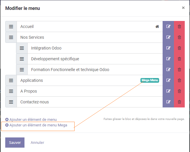 Pour ajouter un méga menu, vous n’avez qu’à cliquer sur l’option modifier le menu , de l’option pages, puis, en bas vous cliquer sur le lien de l’option ajouter un élément du menu Méga.