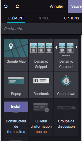 Pour se faire nous devons installer d’abord le module formulaire, en se rendant sur la page contactez nous, cliquez sur Éditer (à droite) et sur le panneau de widgets en bas de page de l’onglet élément, choisissez l’option constructeur de formulaire puis cliquez sur le bouton installer.