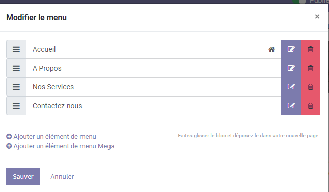 Une dernière chose qu’on doit faire sur notre page nouvellement créée, est de le la mettre dans le bon ordre dan notre menu principale, pour se faire, il suffit de cliquer sur l’option pages qui se situe en haut à gauche, puis cliquez sur l’option menu principale, une fois affiché, vous n’avez qu’à déplacer avec la sourie, l’option A propos et de la mettre juste avant l’option contactez nous, puis sauver les modifications.