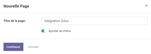 Une fois l’option page choisie, une fenêtre s’affiche pour nous demander de donner un nom à notre page, mettez le nom : A Propos par exemple, sélectionnez l’option ajouter au menu principal, puis cliquer sur Continuer.