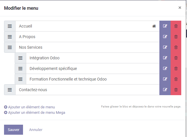 Pour se faire, c’est simple, il suffit d’aller dans l’option page de notre menu d’édition, puis cliquez sur le menu principale, le menu affiche les pages de notre site, Vous n’avez qu’à les déposer avec l’ordre souhaité sous la page Nos service, en utilisant la souris.