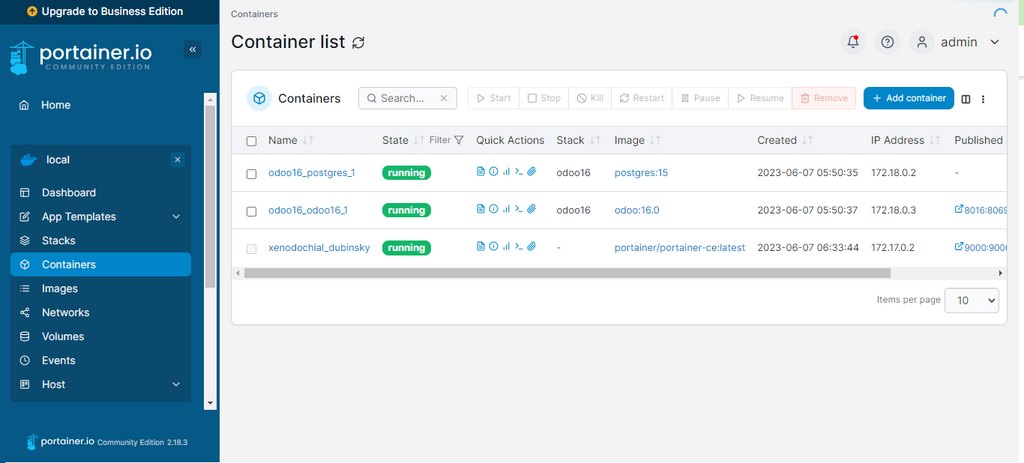 Si vous accéder à un conteneur (choisissez Odoo par exemple), vous trouverez les commandes nécessaires au démarrage, arrêt, suppression, redémarrage ainsi que plein d’autres outils de monitorings et de logs.