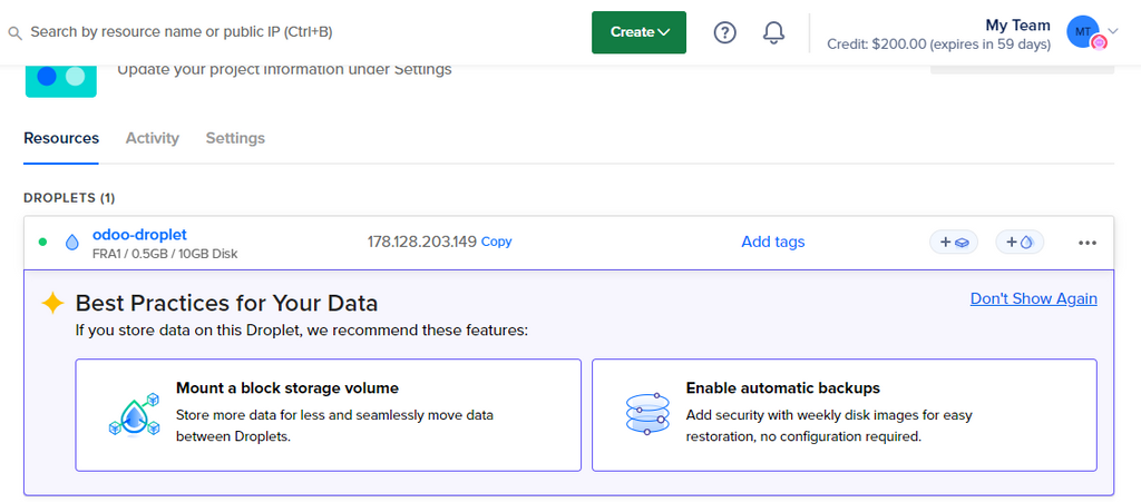 Dans cette première partie, nous avons pu créer un VPS, en utilisant la notion droplet du fournisseur de services cloud , digital-ocean- qui utilise la notion Droplet pour désigne un VPS ou Virtual Private Server), en lui affectant les ressources nécessaires à une bonne utilisation de notre instance Odoo.