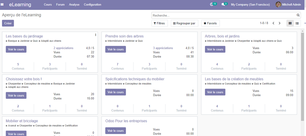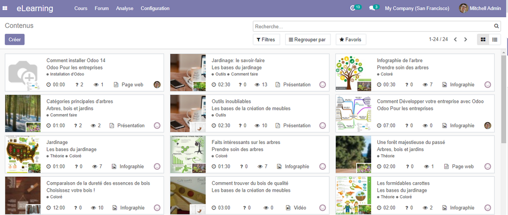 En cliquant sur l’option e-Learning, on obtient une vue Kanban contenant, les cours créés sur la plateforme e-Learning d’Odoo.