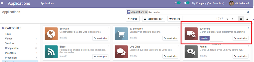 Pour installer l’application e-learning, il suffit de se rendre sur la partie application, sélectionner le type web site, puis de cliquer sur le bouton installer à côté de l’application e-learning et de patienter le temps que le module s’installe.