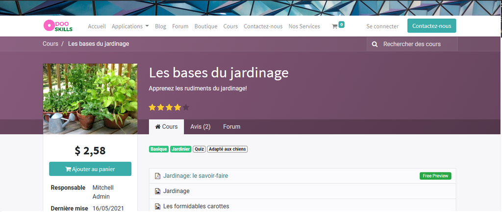Il trouve également la description du contenu, et peut visualiser les contenus gratuits à l’intérieur de ce cours (des aperçus de démonstrations), mais pour visualiser le cours complet il doit payer le cours.