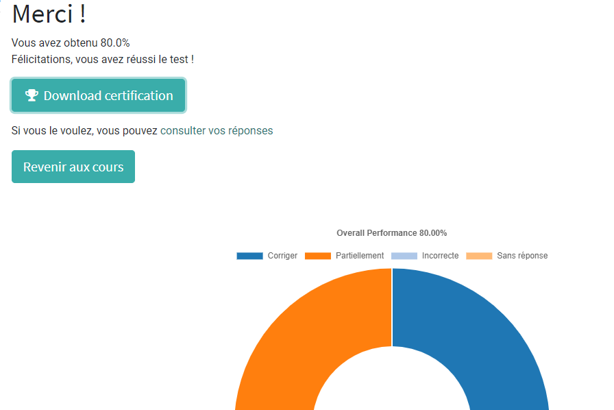 Si le pourcentage des réponses est supérieur ou égale au pourcentage demandé, vous serez considéré comme réussi et une certification vous aurez transmis automatiquement à votre boite email, sinon vous redémarrer une autre tentative.