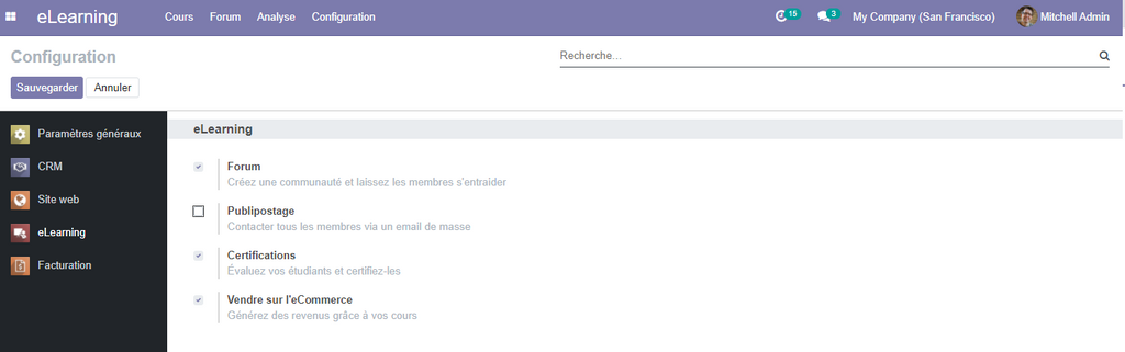 Pour activer les autres options de l’application e-Learning, allez sur la partie configuration e-Learning : e-Learning|Configuration|Configuration .