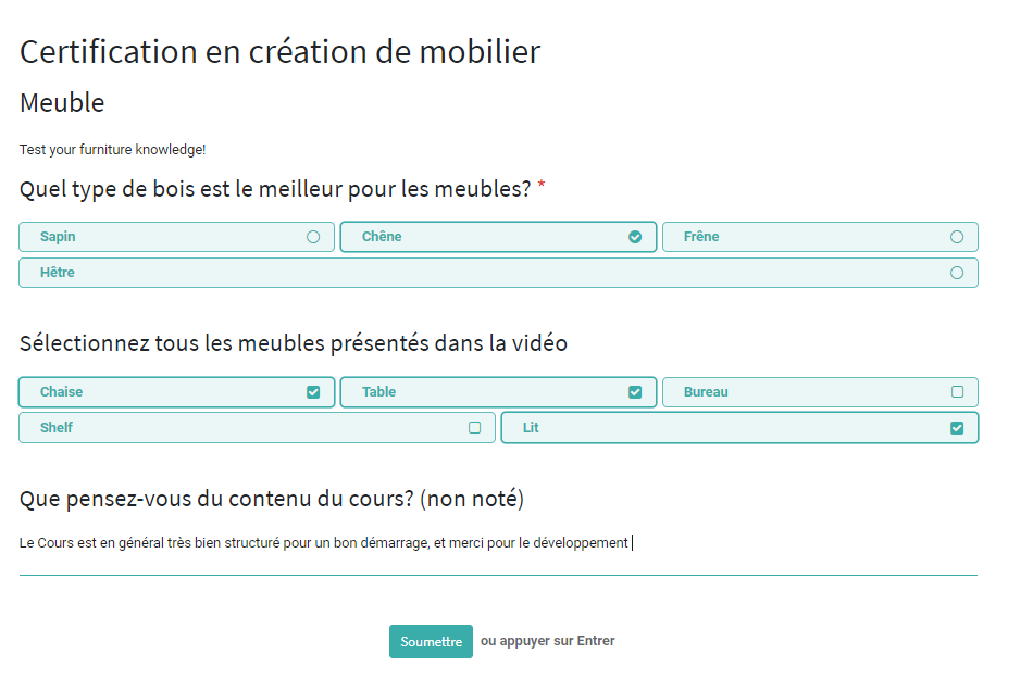 Une Fois vous finissez le remplissage du questionnaire, vous pouvez envoyer les réponses en cliquant sur le bouton soumettre, par la suite vous aurez une page qui vous affiche le résultat de vos réponses.