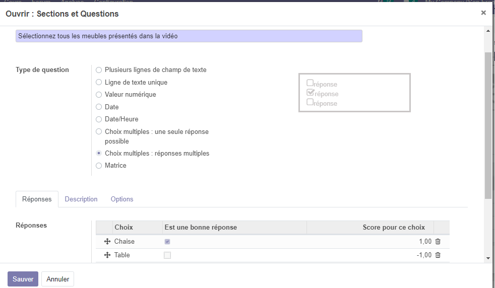 En bas préciser le(les) réponse(s) à cette question, et la notation (score) à donner dans le cas d’échec ou d’une réponse correcte. Vous pouvez ajouter une description à cette question.