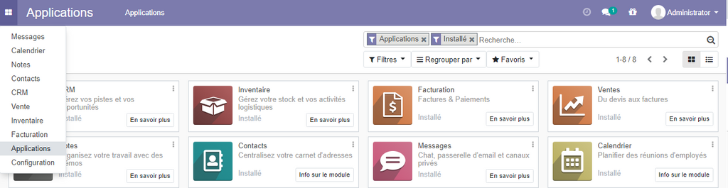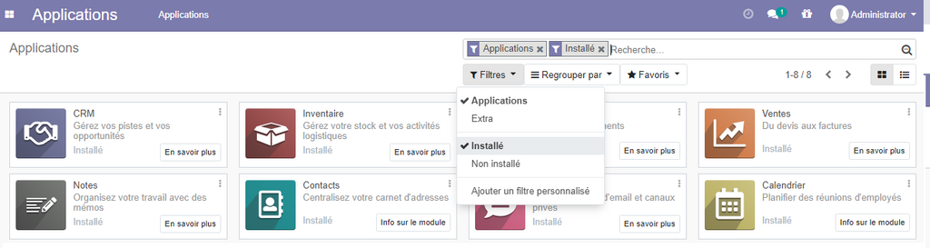 Une fois l'installation de tous les applications de gestion commerciale sera terminée , allez sur le menu puis applications, et activer un filtre qui permet d'afficher les applications installées uniquement.