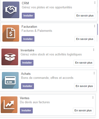 La même procédure est applicable, sur n'importe quel application , compléter donc l'installation des autres modules Vente, Facturation, Achat et CRM.