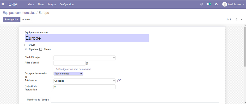 Vous pouvez bien sur définir le chef d'équipe et d'autres information pour chaque équipe commerciale.