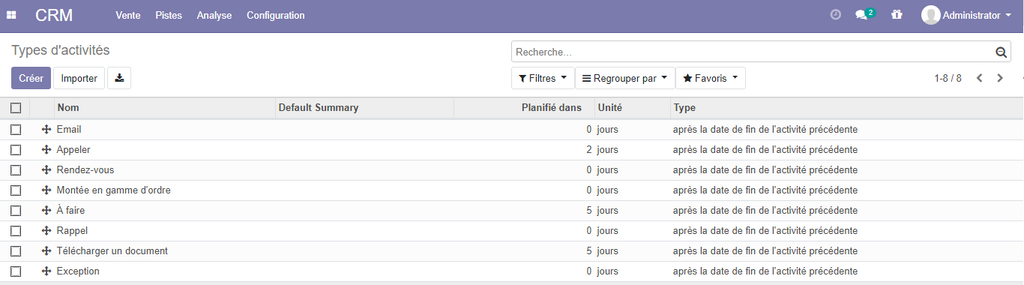 odoo définit par défaut une liste d'activités qui permet de gérer plusieurs possibilités d’activités commerciales. vous pouvez ajouter d'autres activités mais le nombre d''activités par défaut suffira largement.