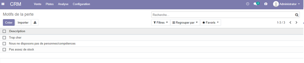 Lorsque vous perdez des opportunités , il est important d'enregistrer le motif de perte, par défaut odoo créer pour vous certains raisons, de perte. Vous pouvez ajouter d'autres motifs si vous le souhaitez