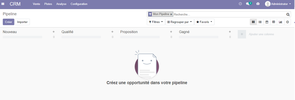 En cliquant dur l'application CRM, odoo affiche votre pipeline , qui permet de visualiser les différents opportunités avec leurs états d'avancement .