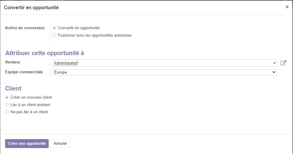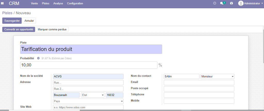 Remplissez les informations nécessaires, et cliquer sur Créer une opportunité . après la création de l'opportunité la piste se déplace vers la vue Kanban de notre pipeline du CRM .
