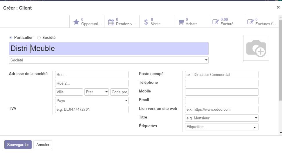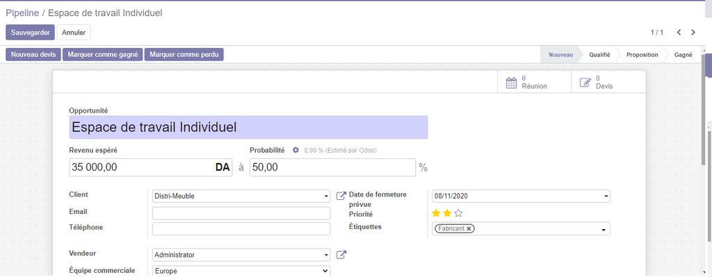 Dans notre exemple , nous allons créer l'opportunité Espace de travail individuel, pur le client Distri-Meuble , le revenu de espéré de cette opportunité est de 35 000, 00 DA , et la notation est de 02 étoiles.