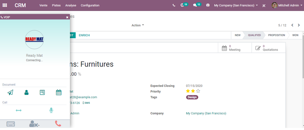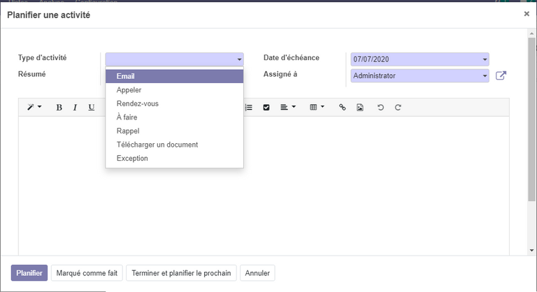 Planifier les activités relatives à une opportunité : il est possible dans odoo de créer et de suivre les activités relatives à une opportunité , Cette activité peut être l'envoi d'un email, passer un appel, ...