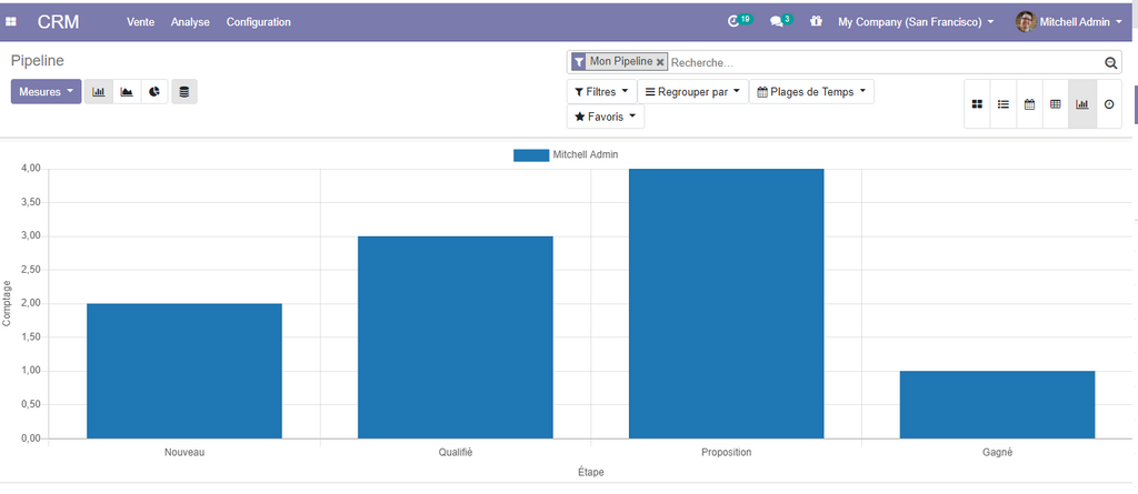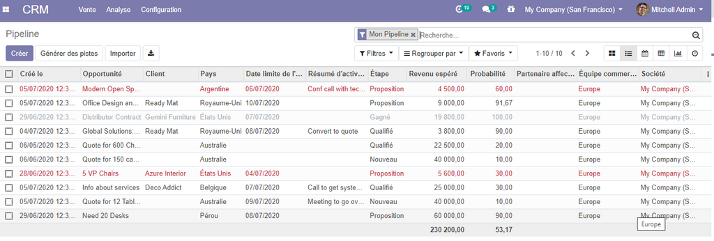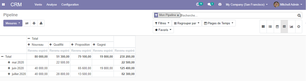 Afin d'avoir une meilleure visibilité sur votre pipeline et les différentes opportunités, et de pouvoir analyser toutes les activités relatives à vos client, odoo vous propose plusieurs vues.