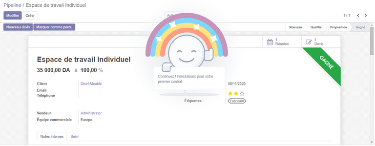 En cliquant sur marquer comme gagné , vous aurez un message de congratulation et l'opportunité est désormais classé comme gagnée. Félicitations ! vous avez gagné l'affaire!
