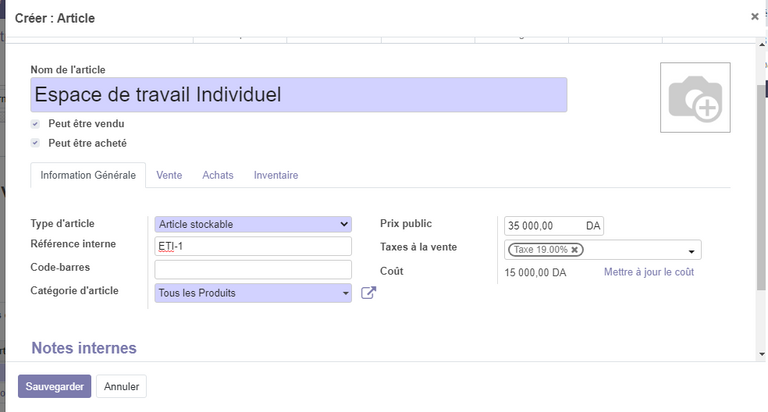 Dans la fenêtre qui s'affiche , choisir le produit Espace de travail individuel, et définissez le pris , puis cliquer sur sauvegarder . (pour plus de détailles sur la création des devis , vous pouvez consulter l'un article : la gestion des vente avec odoo).