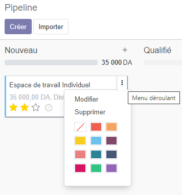 Menu contextuel opportunité : à coté de chaque opportunité , vous pouvez cliquer sur les trois points en haut à droite , pour dérouler le sous menu contextuel, qui vous permettra de modifier, supprimer ou de donner une couleur pour différencier vos opportunités.