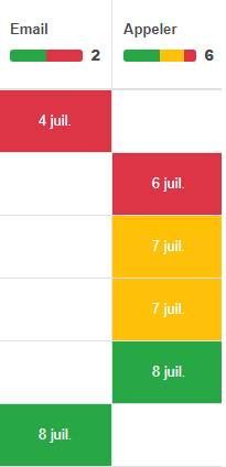 Les activités qui sont planifié après deux jours ou plus de la date du jour, seront affichées en vert. Les activités qui ont la date de planification identique à la date du jour seront affichées en jaune. Les activités en retard seront affichées en rouge .