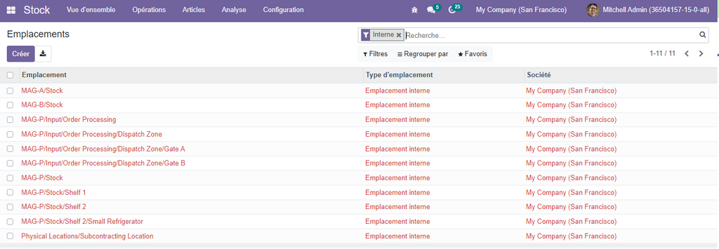 ·         Manufacturions : cette option est active si le module fabrication est installé, et représente les opérations de fabrications dans l’emplacement interne Fabrication.