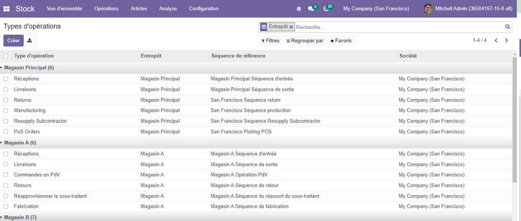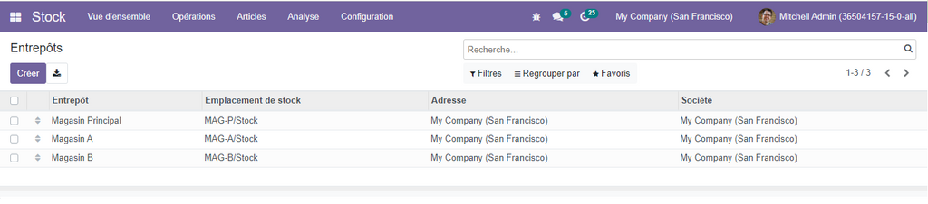 Pour visualiser l’ensemble des entrepôts, allez dans l’option Vue d’ensemble de l’application Stock, vous aurez une vision globale sur toutes les opérations relatives à ces entrepôts.