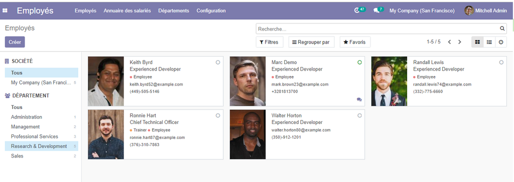 La vue activée par défaut est la vue kanban, vous pouvez visualiser rapidement les informations de base de chaque employé avec son image, son email, sa fonction et son numéro de téléphone.