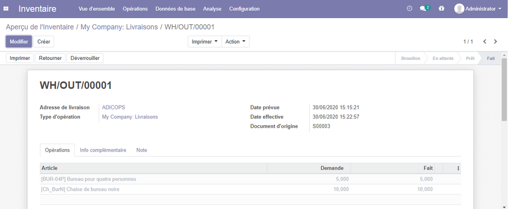 Dans la fenêtre qui s'affiche , cliquer sur le bouton valider , qui nous permettra Quantités de livrer toutes les quantités commandées (bien évidemment, il est possible de faire une livraison partielle, en mentionnant les quantités livrées sur la colonne quantité faite, et de suivre les reliquats, odoo vous calculera automatiquement le reste non livré jusqu'à ce que vous livrer entièrement la commande) .