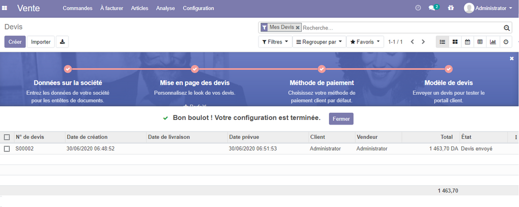 Création des devis client : Lorsqu'on clique sur le menu vente de notre plateforme, odoo nous mènera directement vers la partie gestion des devis clients . vous pouvez remarquer le devis de test créé précédemment lors de notre configuration des donnée de l’entreprise .