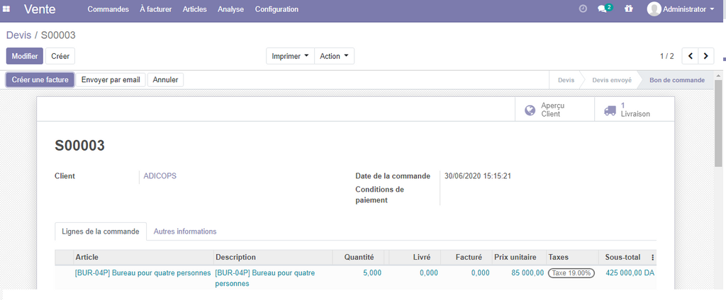 Avec Odoo , le cycle de vente, est optimisé et simplifié . on commence par l’élaboration du devis au client à travers un simple formulaire, qui va contenir les détailles du devis et les produits à inclure . une fois le client valide la commande, on clique sur un simple bouton , la commande est lancée, et deux actions seront déclenchées, la livraison du stock au client et la facturation.