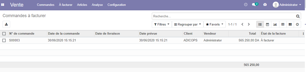 Une autre manière de facturer vos commandes , est d'aller sur la partie A facturer de l'application vente, une liste de tous les commandes non facturés sera affichée pour vous.