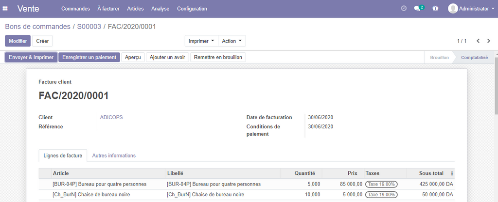 Après la validation de votre facture , un numéro séquentiel automatique, de votre facture sera créé comme dans notre exemple, (FAC/2020/001) pour identifier vos factures , et elle sera affiché dans la partie comptabilité.