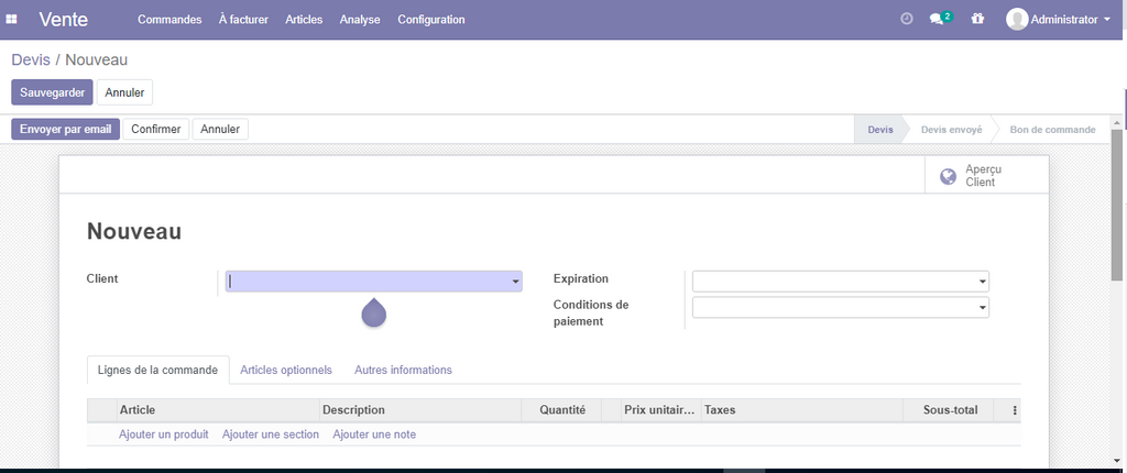 Pour créer une nouvelle commande, il est possible de ne pas passer par l'étape création du devis et allez directement vers le menu Ventes puis commandes client et créer sur place la commande client.