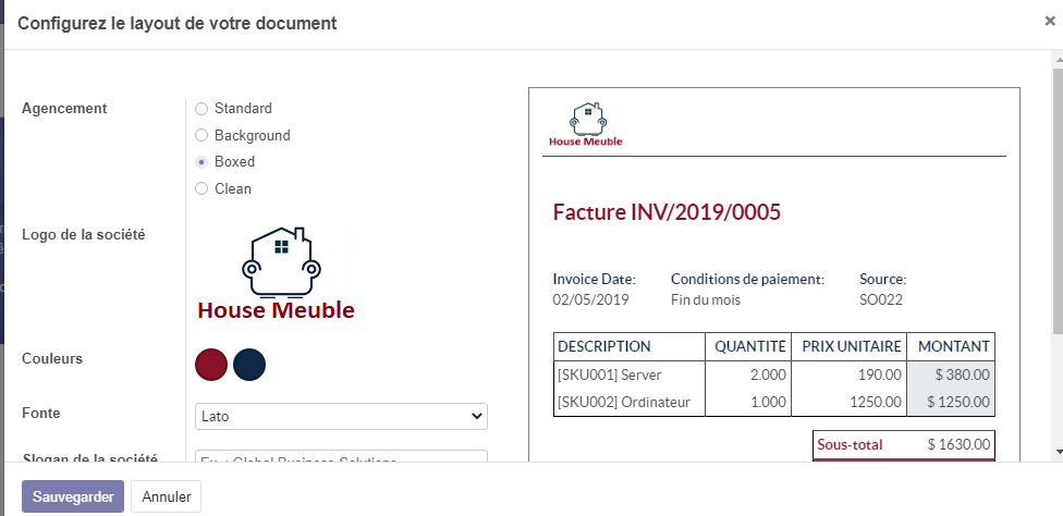 Dans notre exemple, nous avons choisi le layout boxed, il est possible également d'introduire d'autres informations sur le pied de page, tel que le slogan, le type de papier , etc.