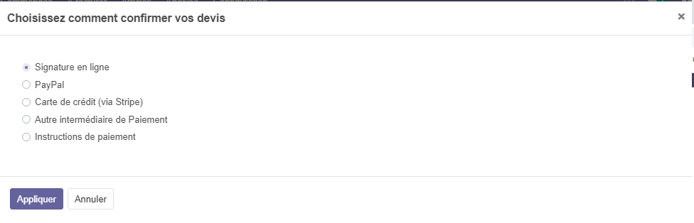 Méthode paiement : ce bouton, vous permettra de choisir comment confirmer vos commandes , on va laisser cette option comme proposé par odoo
