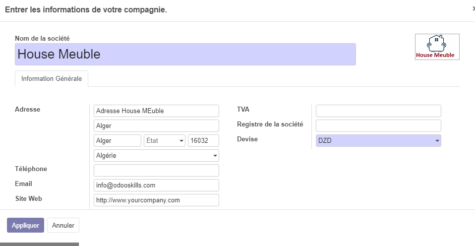 Données sur la société : en cliquant sur ce bouton , nous aurons l'accès sur l'interface d'introduction des données relatif à notre société (le nom, l'adresse,